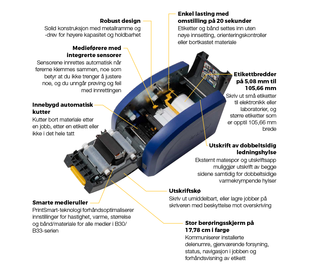 Konfigurer, skift ut og skriv ut raskere enn du kan forestille deg med BradyPrinter i5300 industriell etikettskriver. Den er intuitiv, autokalibrerende og presis, og skriver ut strekkoder og liten skrift på etiketter ned til 5,08 mm. Med sin solide metallrammekonstruksjon kan den både håndtere etiketter i stort volum og store variasjoner: elektronikk- og produkt-ID, kabel- og panel-ID, lab-ID og sikkerhets- og anleggs-ID.