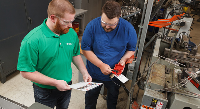 Sørg for å ha tilstrekkelig opplæring med de ansatte, kommuniser prosedyrer for avlåsing/merking og utfør regelmessige inspeksjoner for å sikre at programmet fungerer effektivt. Opplæringen bør omfatte både lovpålagte krav og spesifikke elementer i programmet for avlåsing/merking, for eksempel maskinspesifikke prosedyrer.