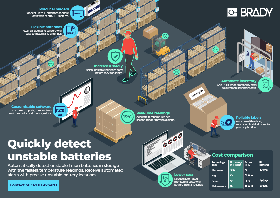 Oppdager automatisk ustabile litium-ion-batterier under lagring med de raskeste temperaturavlesningene. Unngå driftsavbrudd med en kostnadseffektiv løsning som samtidig muliggjør automatisert oversikt over batteribeholdningen.